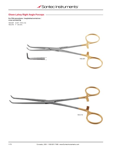 Olsen-Lahey Right Angle Forceps For PDA procedures / longitudinal serrations / cross-serrated tip 150-307 5 3/4˝ (14.5 cm) 150-315 7˝ (18 cm) 150-307 150-315 1170 Colorado, USA / 1.800.821.7496 / www.SontecInstruments.com