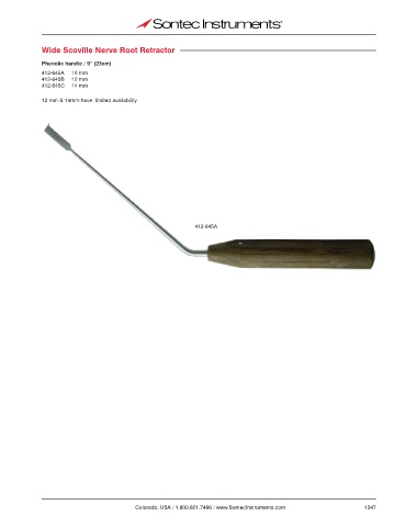 Wide Scoville Nerve Root Retractor Phenolic handle / 9” (23cm) 412-645A 10 mm 412-645B 12 mm 412-645C 14 mm 12 mm & 14mm have limited availability 412-645A Colorado, USA / 1.800.821.7496 / www.SontecInstruments.com 1347