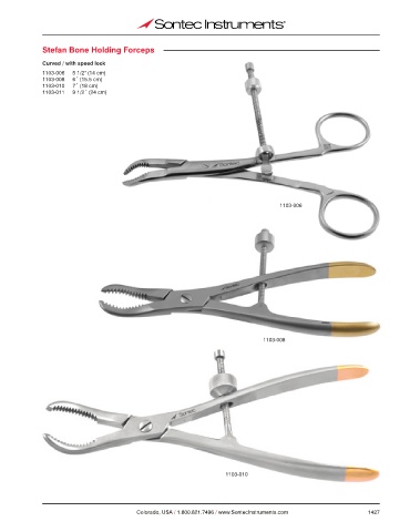 Stefan Bone Holding Forceps Curved / with speed lock 1103-006 5 1/2" (14 cm) 1103-008 6˝ (15.5 cm) 1103-010 7˝ (18 cm) 1103-011 9 1/2˝ (24 cm) 1103-006 1103-008 1103-010 Colorado, USA / 1.800.821.7496 / www.SontecInstruments.com 1427