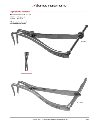 Inge Neroma Retractor With crossover tip / 6 1/2" (16.5 cm) 417-048 with speedlock 417-048R with ratchet * Custom blunt or shortened tips available upon request 417-048 417-048R Colorado, USA / 1.800.821.7496 / www.SontecInstruments.com 1561