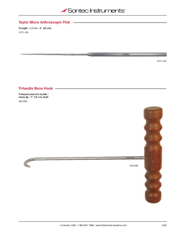 Taylor Micro Arthroscopic Pick Straight / 1.2 mm / 8˝ (20 cm) 1271-120 1271-120 T-Handle Bone Hook T-shaped phenolic handle / sharp tip / 7” (18 cm) shaft 320-936 320-936 Colorado, USA / 1.800.821.7496 / www.SontecInstruments.com 1625