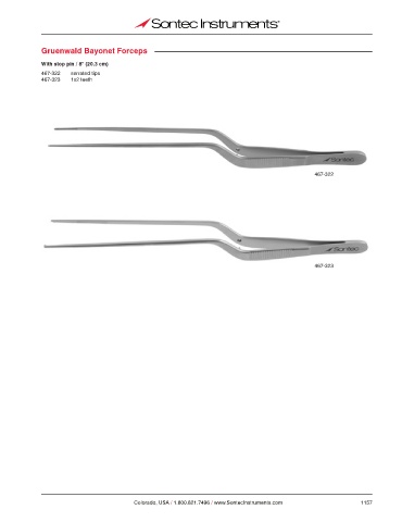 Gruenwald Bayonet Forceps With stop pin / 8" (20.3 cm) 467-322 serrated tips 467-323 1x2 teeth 467-322 467-323 Colorado, USA / 1.800.821.7496 / www.SontecInstruments.com 1157