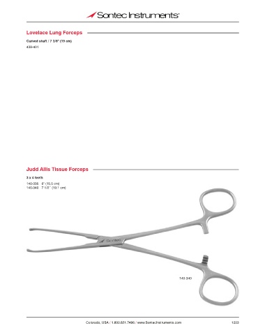Lovelace Lung Forceps Curved shaft / 7 3/8" (19 cm) 438-401 Judd Allis Tissue Forceps 3 x 4 teeth 140-335 6" (15.5 cm) 140-340 7 1/2˝ (19.1 cm) 140-340 Colorado, USA / 1.800.821.7496 / www.SontecInstruments.com 1203