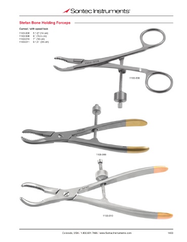 Stefan Bone Holding Forceps Curved / with speed lock 1103-006 5 1/2" (14 cm) 1103-008 6˝ (15.5 cm) 1103-010 7˝ (18 cm) 1103-011 9 1/2˝ (24 cm) 1103-006 1103-008 1103-010 Colorado, USA / 1.800.821.7496 / www.SontecInstruments.com 1433