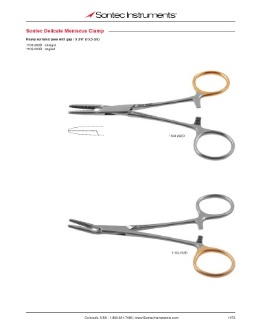 Sontec Delicate Meniscus Clamp Heavy serrated jaws with gap / 5 3/8" (13.5 cm) 1103-202D straight 1103-203D angled 1103-202D 1103-203D Colorado, USA / 1.800.821.7496 / www.SontecInstruments.com 1473