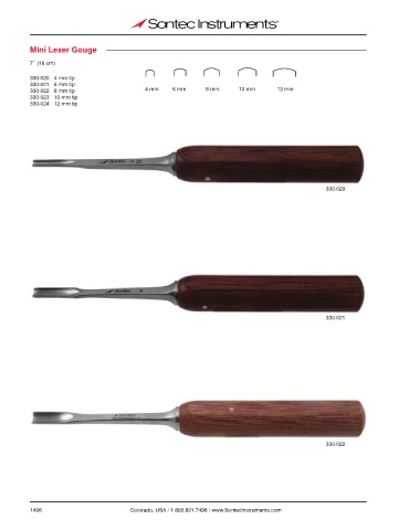 Mini Lexer Gouge 7˝ (18 cm) 330-020 4 mm tip 330-021 6 mm tip 330-022 8 mm tip 4 mm 6 mm 8 mm 10 mm 12 mm 330-023 10 mm tip 330-024 12 mm tip 330-020 330-021 330-022 1498 Colorado, USA / 1.800.821.7496 / www.SontecInstruments.com