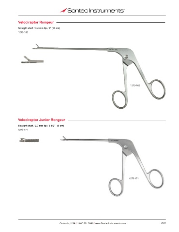 Velociraptor Rongeur Straight shaft / 3.4 mm tip / 5" (13 cm) 1273-162 1273-162 Velociraptor Junior Rongeur Straight shaft / 2.7 mm tip / 3 1/2”˝ (9 cm) 1273-171 1273-171 Colorado, USA / 1.800.821.7496 / www.SontecInstruments.com 1767