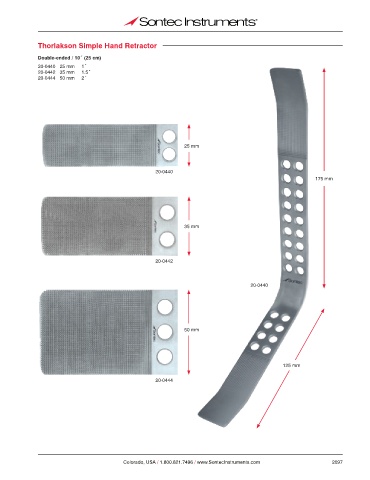 Thorlakson Simple Hand Retractor Double-ended / 10˝ (25 cm) 20-0440 25 mm 1˝ 20-0442 35 mm 1.5˝ 20-0444 50 mm 2˝ 25 mm 20-0440 175 mm 35 mm 20-0442 20-0440 50 mm 125 mm 20-0444 Colorado, USA / 1.800.821.7496 / www.SontecInstruments.com 2097
