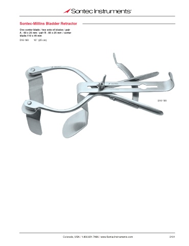 Sontec-Millins Bladder Retractor One center blade / two sets of blades / pair A - 60 x 25 mm / pair B - 85 x 25 mm / center blade-110 x 45 mm 516-190 10˝ (25 cm) 516-190 Colorado, USA / 1.800.821.7496 / www.SontecInstruments.com 2101