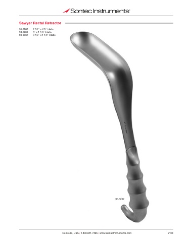 Sawyer Rectal Retractor 90-0260 2 1/2˝ x 7/8˝ blade 90-0261 3˝ x 1 1/8˝ blade 90-0262 3 1/2˝ x 1 1/2˝ blade 90-0262 Colorado, USA / 1.800.821.7496 / www.SontecInstruments.com 2103