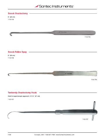 Snook Ovariectomy 8˝ (20 cm) 1100-756 1100-756 Snook Feline Spay 8˝ (20 cm) 1100-758 1100-758 Tankersly Ovariectomy Hook Used in Laparoscopic approach / 8 1/4˝ (21 cm) 1100-757 1100-757 2198 Colorado, USA / 1.800.821.7496 / www.SontecInstruments.com