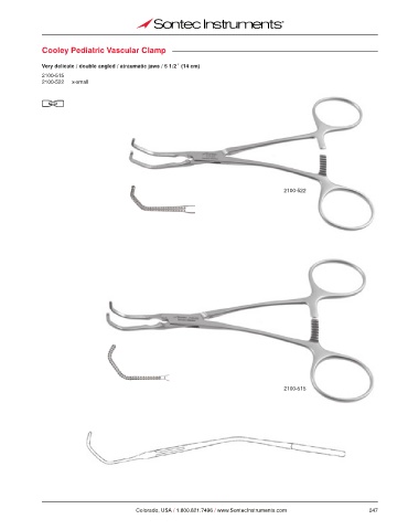 Cooley Pediatric Vascular Clamp Very delicate / double angled / atraumatic jaws / 5 1/2˝ (14 cm) 2100-515 2100-522 x-small 2100-522 2100-515 Colorado, USA / 1.800.821.7496 / www.SontecInstruments.com 247