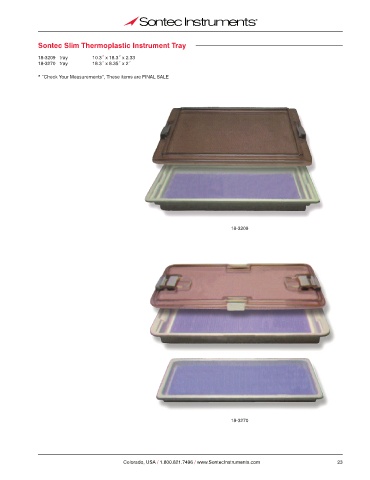Sontec Slim Thermoplastic Instrument Tray 18-3209 tray 10.3˝ x 18.3˝ x 2.33 18-3270 tray 18.3˝ x 8.35˝ x 2˝ * “Check Your Measurements”, These items are FINAL SALE 18-3209 18-3270 Colorado, USA / 1.800.821.7496 / www.SontecInstruments.com 23