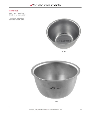 Iodine Cup ST6G 6 oz. 3 7/16˝ x 2˝ ST14-G 14 oz. 4 3/8˝ x 2 5/8˝ * “Check Your Measurements”, These items are FINAL SALE ST14-G ST6G Colorado, USA / 1.800.821.7496 / www.SontecInstruments.com 29