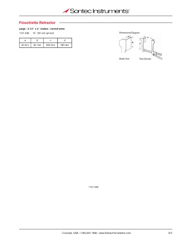 Finochietto Retractor Large / 2 3/4˝ x 2˝ blades / curved arms 1101-536 12˝ (30 cm) spread a b c d 50 mm 65 mm 305 mm 180 mm 1101-536 Colorado, USA / 1.800.821.7496 / www.SontecInstruments.com 315