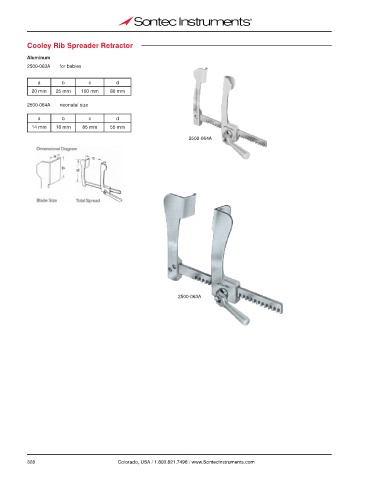 Cooley Rib Spreader Retractor Aluminum 2500-063A for babies a b c d 20 mm 25 mm 100 mm 80 mm 2500-064A neonatal size a b c d 14 mm 16 mm 85 mm 55 mm 2500-064A 2500-063A 328 Colorado, USA / 1.800.821.7496 / www.SontecInstruments.com
