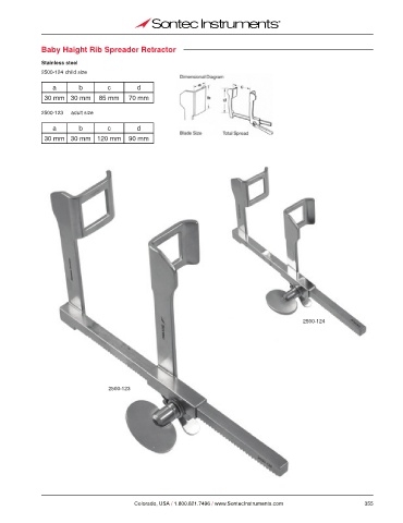 Baby Haight Rib Spreader Retractor Stainless steel 2500-124 child size a b c d 30 mm 30 mm 85 mm 70 mm 2500-123 adult size a b c d 30 mm 30 mm 120 mm 90 mm 2500-124 2500-123 Colorado, USA / 1.800.821.7496 / www.SontecInstruments.com 355
