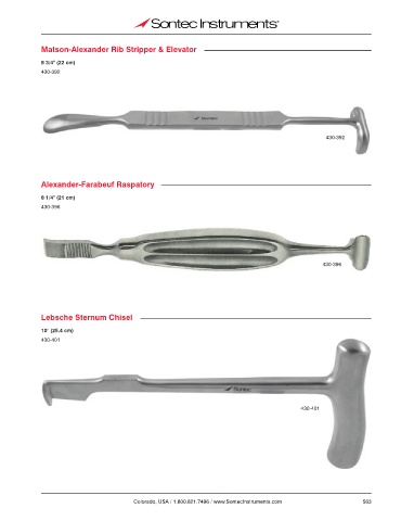 Matson-Alexander Rib Stripper & Elevator 8 3/4" (22 cm) 430-392 430-392 Alexander-Farabeuf Raspatory 8 1/4" (21 cm) 430-396 430-396 Lebsche Sternum Chisel 10" (25.4 cm) 430-401 430-401 Colorado, USA / 1.800.821.7496 / www.SontecInstruments.com 563