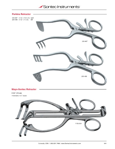 Perkins Retractor 230-487 5 1/4˝ (13.5 cm) right 230-488 5 1/2˝ (14 cm) left 230-487 230-488 Mayo-Sontec Retractor 6 3/4˝ (16 cm) 1100-634 2 1/4˝ blade 1100-634 Colorado, USA / 1.800.821.7496 / www.SontecInstruments.com 641