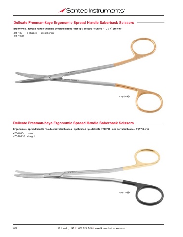 Ergonomic / spread handle / double beveled blades / spatulated tip / delicate / TC/PC / one serrated blade / 7" (17.8 cm)