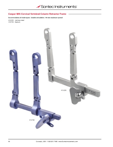 Caspar MIS Cervical Vertebral Column Retractor Frame Accommodates all blade types / double articulation / 90 mm maximum spread 416-200 stainless steel 416-700 titanium 416-200 416-700 66 Colorado, USA / 1.800.821.7496 / www.SontecInstruments.com