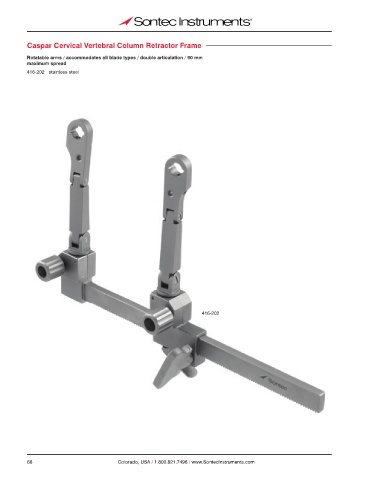 Caspar Cervical Vertebral Column Retractor Frame Rotatable arms / accommodates all blade types / double articulation / 90 mm maximum spread 416-202 stainless steel 416-202 68 Colorado, USA / 1.800.821.7496 / www.SontecInstruments.com