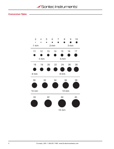 Conversion Table 3 4 5 6 7 8 9 10 1 mm 2 mm 3 mm 11 12 13 14 15 16 17 4 mm 5 mm 18 19 20 22 24 26 28 6 mm 8 mm 30 32 34 36 38 10 mm 12 mm 40 42 44 45 15 mm 6 Colorado, USA / 1.800.821.7496 / www.SontecInstruments.com