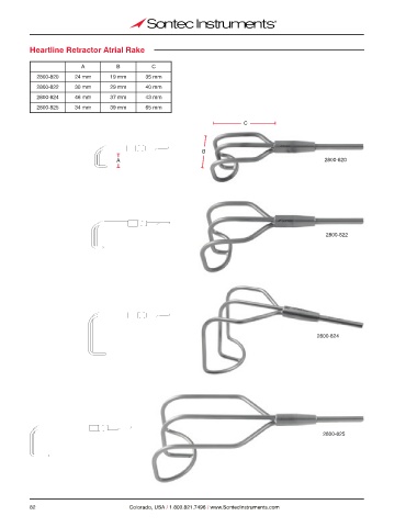 Heartline Retractor Atrial Rake A B C 2800-820 24 mm 19 mm 35 mm 2800-822 30 mm 29 mm 40 mm 2800-824 46 mm 37 mm 43 mm 2800-825 34 mm 39 mm 65 mm C B A 2800-820 2800-822 2800-824 2800-825 82 Colorado, USA / 1.800.821.7496 / www.SontecInstruments.com